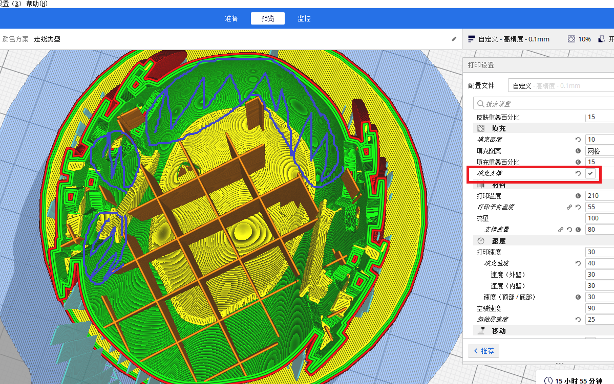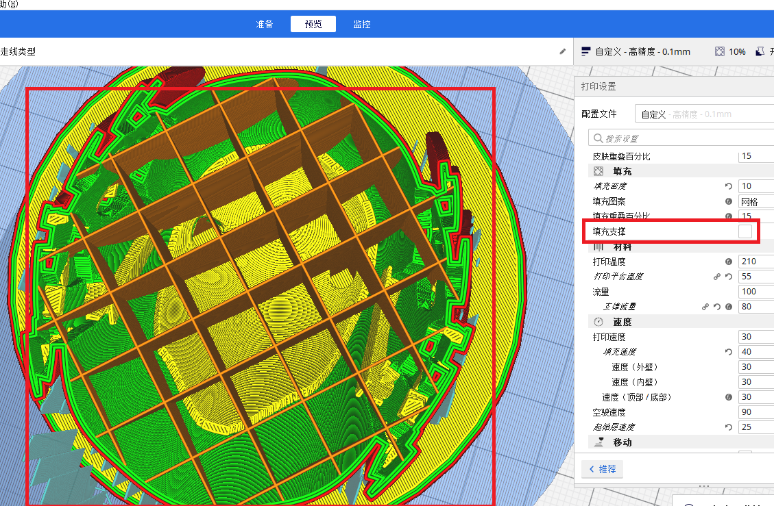 此功能可實現(xiàn)只在模型頂部需要支撐的區(qū)域產(chǎn)生填充,相比無填充,保證了模型頂部不會掉落,并較大幅度減少了打印時間和用料。