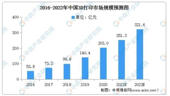 隨著政策的支持及企業(yè)的創(chuàng)新突破,我國(guó)3D打印產(chǎn)業(yè)有望獲得持續(xù)發(fā)展。據(jù)中商產(chǎn)業(yè)研究院預(yù)測(cè),2022年我國(guó)3D打印市場(chǎng)規(guī)模有望增長(zhǎng)至321.6億元。