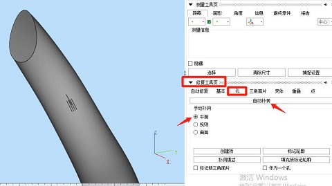 ④使用“修復工具頁”,選擇“孔”,選擇“平面”,對分割后的2個模型都進行自動補洞,也可以根據實際孔洞的起伏形狀來選擇“曲面”或“規(guī)則”來補洞。