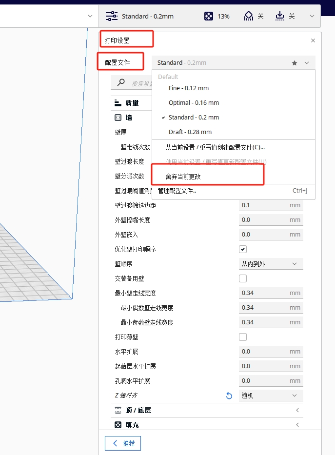 很簡(jiǎn)單,您只需在軟件右邊“打印設(shè)置”-“配置文件”中點(diǎn)擊“舍棄當(dāng)前更改”就可以恢復(fù)到默認(rèn)設(shè)置。