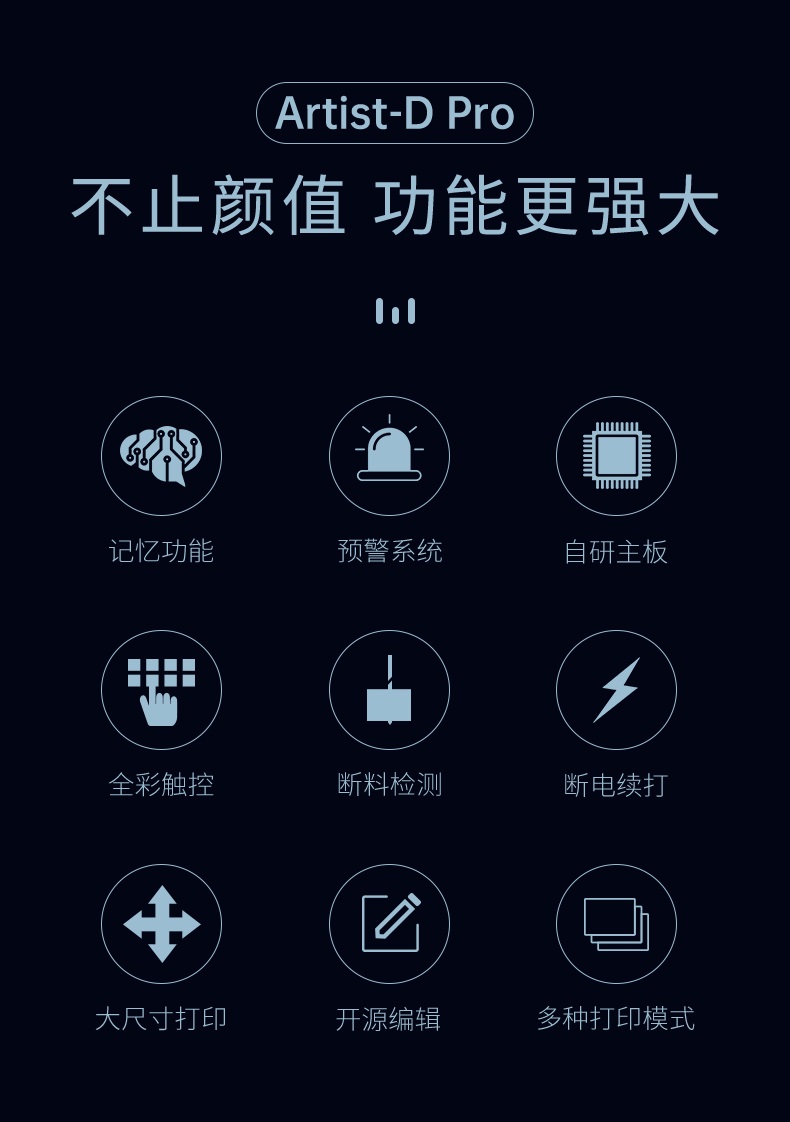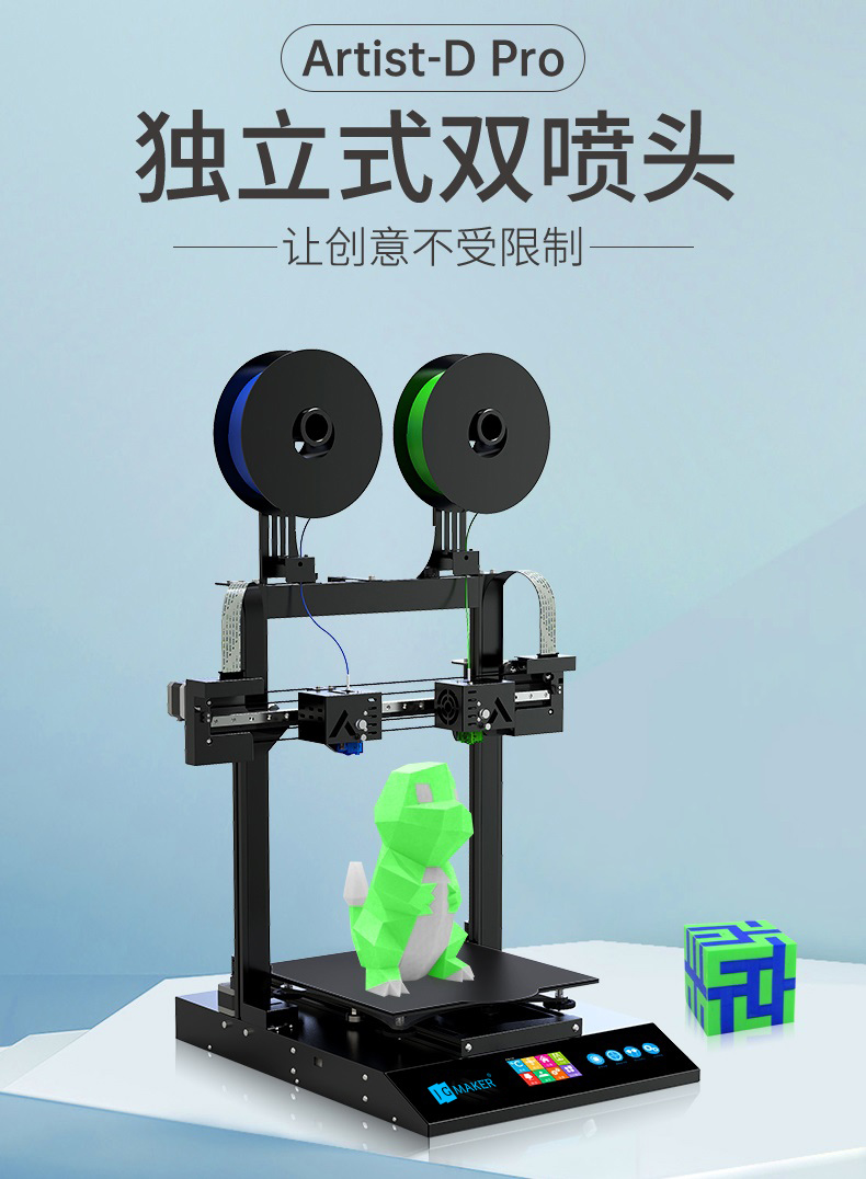 Artist-D pro雙噴頭3D打印機,采用獨立式噴頭,支持4種打印模式,采用高精度運動組件,靜音主板,支持開源。